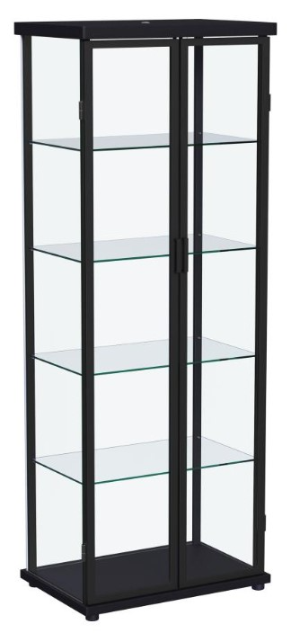 Its glass sides and back are complemented by a pair of clear glass doors, offering a full view of items placed within. Four glass shelves hold an impressive number of treasures, creating a curated display you'll love. Recessed lighting completes the look to perfection.