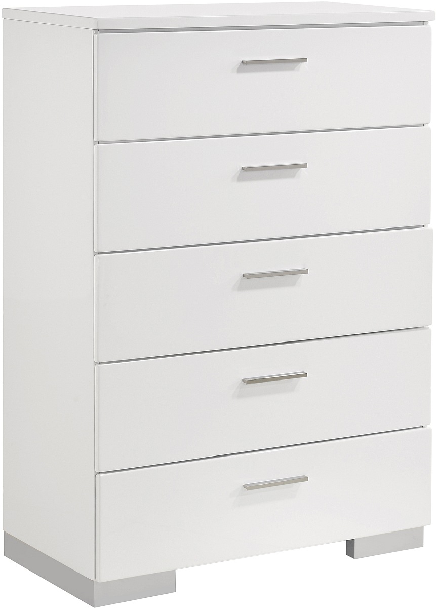 Light and airy, the Felicity collection turns your bedroom into a dreamy retreat. The glossy white finish, clean lines, and polished-chrome details breathe contemporary vibes that revitalize and soothe. Delight in the new energy and crisp feel of your sleep space with this Coaster® collection.