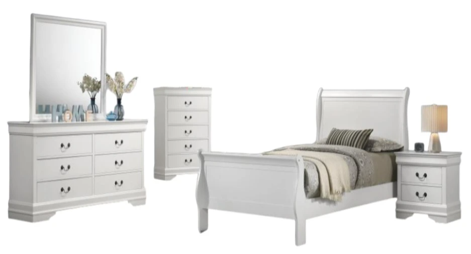 The Coaster® Louis Philippe 5-Piece White Twin Bedroom Set exudes timeless elegance with a sleigh bed, spacious dresser, matching mirror, convenient nightstand, and additional chest. The pristine white finish enhances its traditional design, creating a sophisticated and serene atmosphere, blending both style and functionality seamlessly.Read More