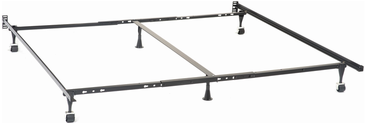 Set up the perfect foundation for a bed ensemble. This bed frame offers structural integrity and a solid design. A two-inch center beam shores up support for any mattress. With six legs on rollers, it allows for easy mobility. Accommodates headboards.