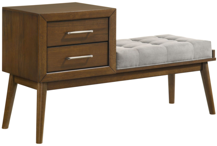The Malibu bench with gray fabric in walnut is constructed with high-quality solid and engineered wood and an aesthetic walnut veneer. Two storage drawers built with skillful dovetailing and smooth center metal glides offer convenient storage space for your essentials, while the tufted, upholstered seat provides comfortable place to rest.Read More