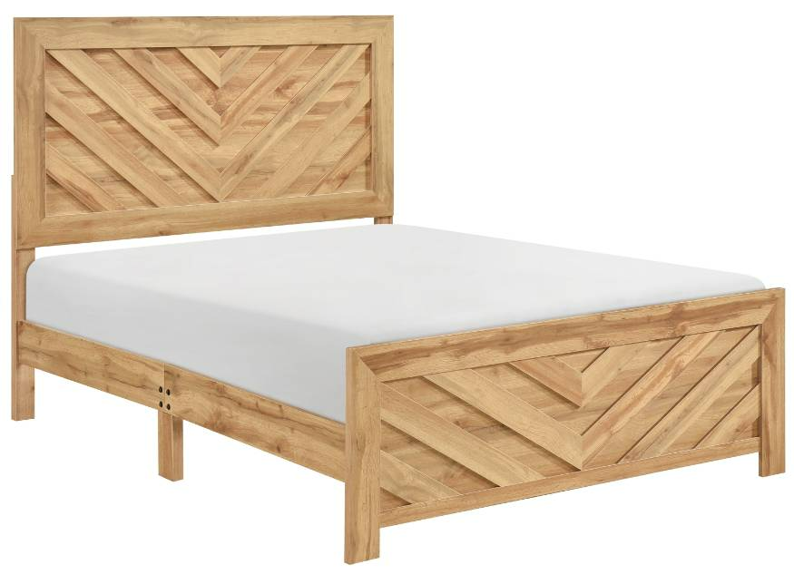 The warm natural finish beautifully highlights the intricate chevron design, creating a focal point in any room. Designed for convenience, it includes the headboard, footboard, and rails, ships efficiently in one compact box, and requires assembly, making it a perfect choice for those seeking contemporary aesthetics with practical delivery (foundation/box spring required).