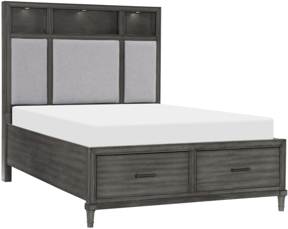 Fabric upholstered headboard with storage cubes, USB charging ports and LED lighting