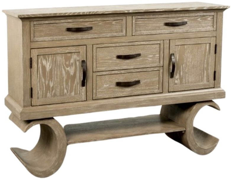 The Gwendolyn server blends rustic charm with modern function, featuring a natural wood grain finish, sculptural curved base, and ample storage with two cabinets and multiple drawers. Perfect for dining rooms or entryways, it offers versatile organization for tableware, linens, or everyday essentials.Read More