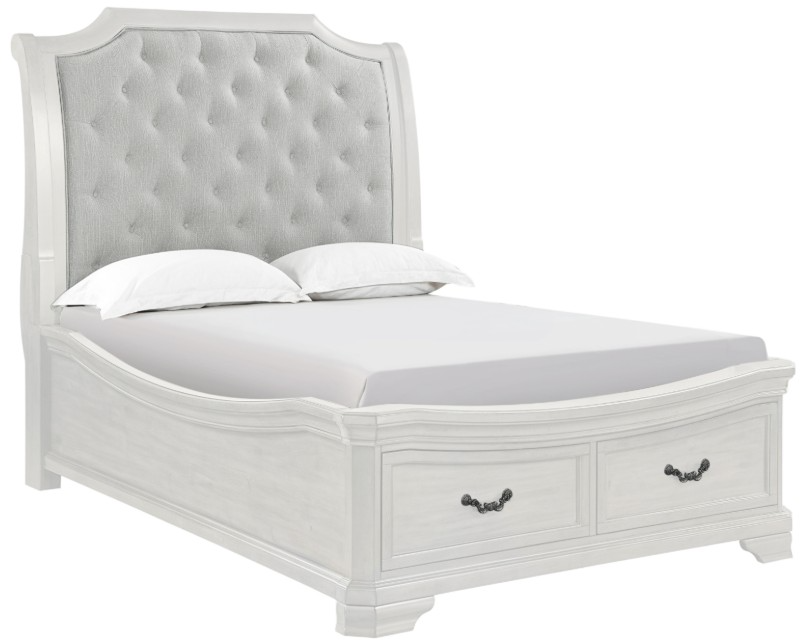 Vintage White Finish: The heirloom finish is achieved through a multi-step process that includes mild distressing, burnishing, and gray glazing that enhances the natural beauty of the wood
