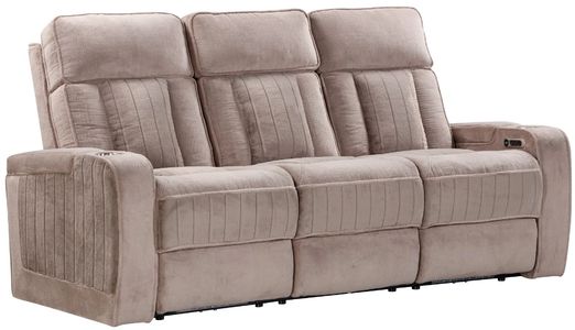 Spice up your movie nights with the Equinox Power Sofa with Drop Down Table. Each power seat features armrest storage and independently operating power headrests for personalized comfort. Equinox's sofa features an ultra convenient drop-down table in the back of the middle seat, offering cup holders, charging, and overhead lights alongside.Read More