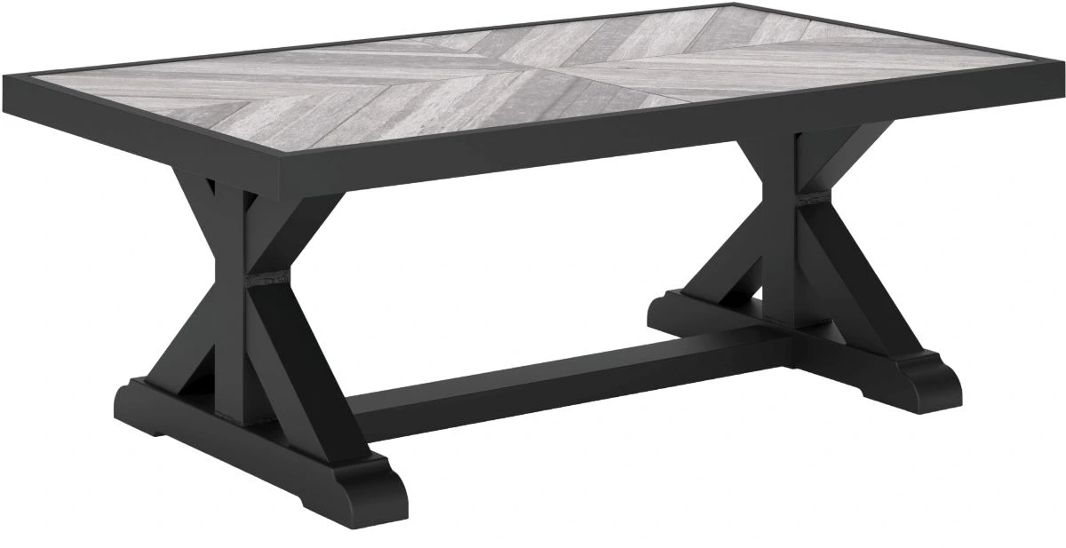 Sporting an easy-on-the-eyes elegance, this coffee table elevates the art of alfresco living. Beautiful and durable enough for indoor and outdoor use, this high-style/low-maintenance table charms with X-leg farmhouse styling. With a unique reverse diamond tile pattern, the thick porcelain tabletop provides unparalleled sophistication.Read More