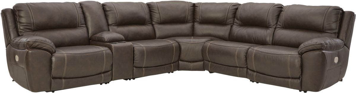 Load up on comfort in a cool, clean-lined and contemporary way with this power reclining sectional in chocolate brown. Rest assured, the expertly matched leather and faux leather upholstery is enriched with a pebble grain effect for authentic appeal and enhanced with jumbo stitching for dramatic contrast.Read More