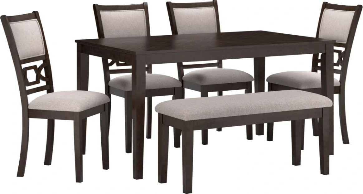 Includes dining table, 4 upholstered chairs and bench