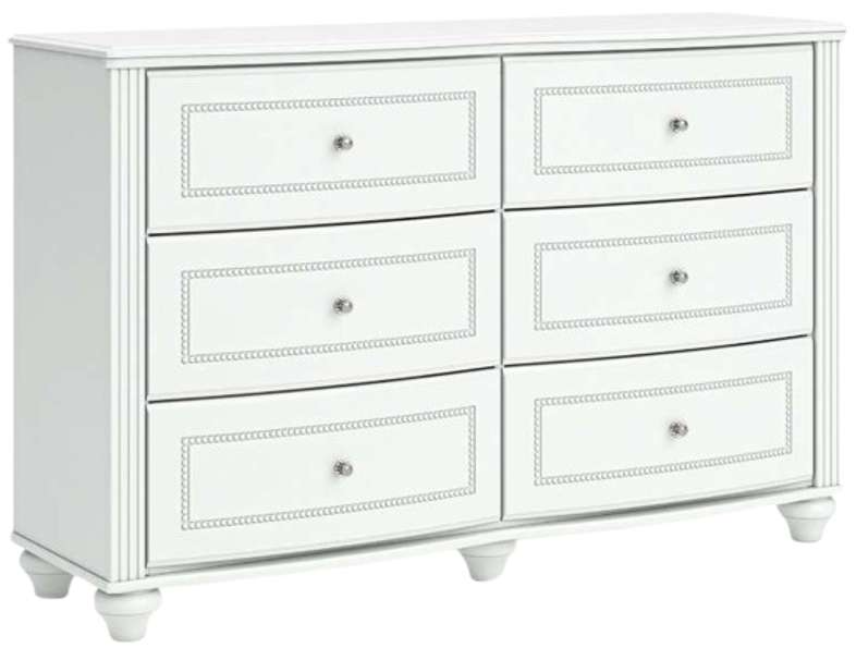 Fit for a princess. This dresser’s crisp matte white finish pairs with charming elements like bun feet, crystal knobs and ornate beading the perfect crowning touches for your girly girl. This spacious six-drawer piece is sure to make your little one feel like royalty.Read More