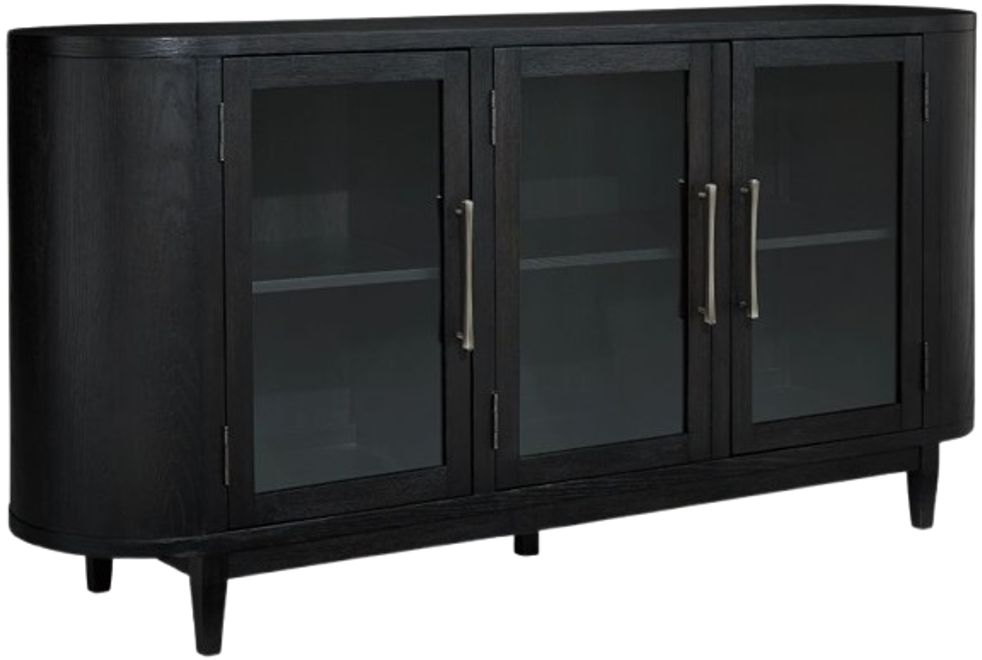 Inspired by art deco design, this dining server makes a lasting impression in a simply stunning way. Its magnificent rounded silhouette is enhanced with a rich layered black finish on the textured wood grain surface. Complete with glass cabinet doors, interior shelving and tapered legs.Read More